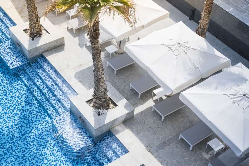 poolside sunbeds, umbrellas, and dining table sets